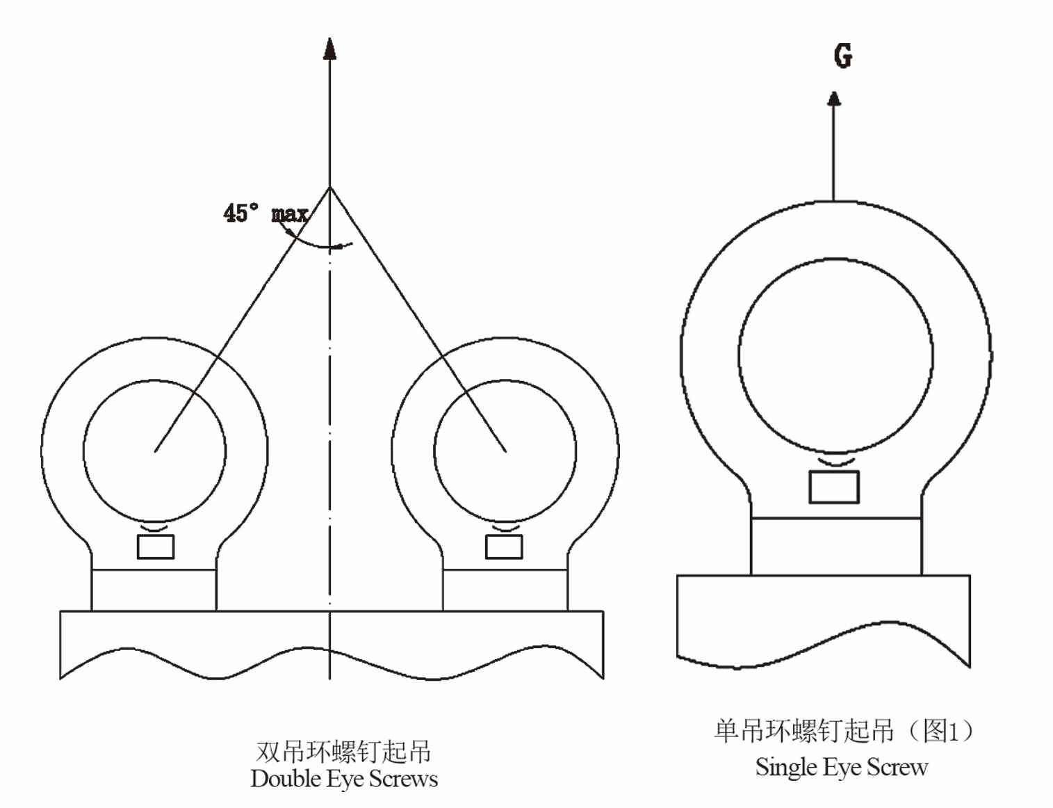3.当采用“双螺钉起吊”(如下图)方式时,应保证两吊环在同一平面内,为此可在支撑面上加放调整垫片,配套锁具的夹角不应大于90度,且每只吊环螺钉的最大起重量应该按额定载荷的1/2计算。